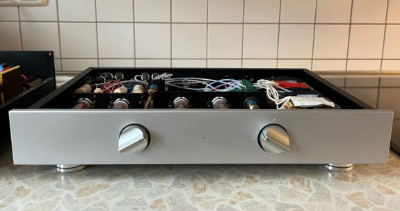 Die SchaltungDie Eingangsstufe des Vorverstärkers besteht aus einem njFet und einem bipolaren PNP-Transistor in einer Sziklai-Konfiguration. R14 gibt den Ruhestrom der Eingangsstufe vor. R9 und R10 verteilen den Ruhestrom auf die beiden Transistoren. Beide Eingangstransistoren werden von der ersten Triode kaskodiert. Die ECC88 ist für den Kaskodenbetrieb mit einer vorgegebenen Triode für die Kaskodierung ausgelegt. Eine 9V Batterie am Gitter der kaskodierenden EC(C)88 hebt deren Kathodenspannung auf 11,2 V an. Im Gegensatz zu einem konventionellen Spannungsteiler ist die chemisch erzeugte Spannung der Batterie frei von Störungen. Die einzige Last ist der winzige Gitterleckstrom. Die Lebensdauer der Batterie ist im Wesentlichen durch ihre Selbstentladung limtiert.Der Eingangsstufe folgt ein passives RIAA Netzwerk und eine zweite spannungsverstärkende Triode am Ausgang.MC step-up Tansformatoren habe ich hier ausgeschlossen. In einem single-ended Design würde der Basisstrom eines bipolaren Eingangstransistors den Kern vormagnetisieren. Bei einem jFET könnte die Eingangskapazität zu einem Problem werden. Die Eingangskapazität des 2SK369 jFet am Gate beträgt 90pf. Wird zum Beispiel ein 1:8 step-up Transformator verwendet, steigt die reflektierte Eingangskapazität Cin auf 5760pF.Abb. 1: Schaltplan des Hybrid-Phono-Vorverstärkers. Alle Ströme und Spannungen sind der LT SPICE-Simulation entnommenSowohl der Lastwiderstand R3 als auch der Gitterableitwiderstand R4 sind RIAA-kritisch. Einzelheiten zum Aufbau des RIAA-Entzerrungsnetzwerks einschließlich einer Präzisions-Anti-RIAA-Schaltung für SPICE-Simulationen sind auf der Laborseite beschrieben. Die Ausgangsstufe umfasst die zweite Triode in einer einfachen Kathodenbasis-schaltung. Der Bypass-Kondensator C3 verhindert die durch den Kathodenwiderstand R5 induzierte Stromgegenkopplung. Dadurch erhöht C3 die Verstärkung und senkt die Ausgangsimpedanz der zweiten Stufe. C3 kann jedoch auch weggelassen werden, wenn er nicht benötigt wird. R1 symbolisiert die Lautstärkeregelung. Mögliche Einschränkungen dieses puristischen Designs sind•Kein Schutz des MC-Tonabnehmers bei Fehlfunktion der Eingangsstufe•Der unsymmetrische Eingang ist anfälliger für Brummeinstreuungen und Störspannungen•Der Anodenwiderstand der ECC88 beträgt etwa 3 kOhm. Dies entspricht in etwa der Ausgangsimpedanz und schränkt die Fähigkeit ein, niederohmige oder kapazitive Lasten zu treiben.Ist die Ausgangsimpedanz der zweiten Stufe unzureichend, kann der Impedanzwandler dieser Website nachgeschaltet werden, um lange Kabel oder kritische Lasten zu treiben. Die Phonostufe wurde 2020 in Betrieb genomen und läuft seitdem problemlos. Sie spielt auf hohem Niveau an einem Benz Micro Wood MC Abtaster (0,9mV, medium output).